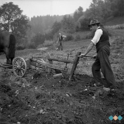 Oranje. "Repico" (krompir) gor mečejo z ora?om (oralom), Rute pri Štriholčah, pri Harniku. Teren I - Koroška, Štajerska, Prekmurje.