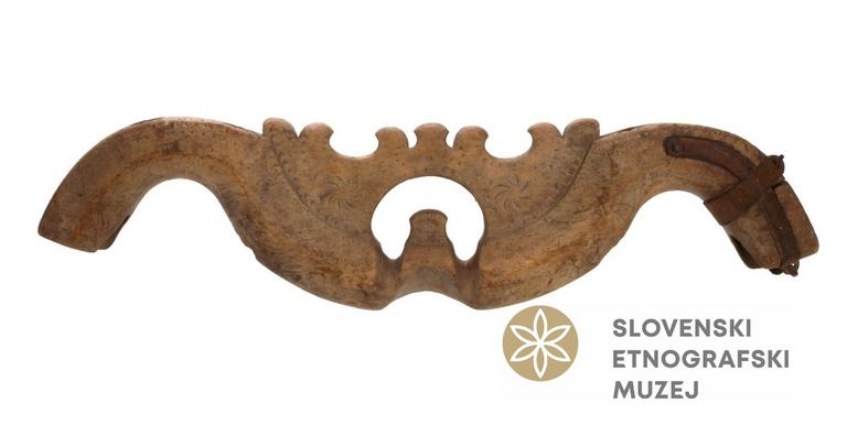 72. d = 104 cm / v sred. dela = 24 cm / g = 7,5 cm // v do vrha ovrat. = 6 cm / š med odprt. kamb = 14 cm / pr. odprt. za kambi = 3,5 cm T = 12,52 kg Jarem neznane provenience, a glede na obliko in izvedbo posameznih detajlov (na primer dveh spiralnih rozet) dokaj soroden primerku s kat. št. 71, EM 8397. Morda je mogoče premišljati celo o istem izdelovalcu iz okolice Šentvida pri Stični. Primerek ima razgibano oblikovano krono. Njegovo telo je posuto z redkimi nizi luskastih vrezov. Levo in desno od gožinega sedeža sta spredaj vrezani osem oziroma devetlistni (kraki) spiralni rozeti, na njegovem hribcu je na sredini s štirimi luskastimi vrezi narejena oblika, ki spominja na križ (malteški, z razmaknjenimi kraki). Pod gožinim sedežem je močno vdolbljen del, kamor je pod jarem sedalo oje. Vse odprtine za kambi so spodaj odkrhnjene; desna stran jarma oziroma zunanji del ovratnika leve vprežne živali je bil zlomljen je posledično močno okovan (z vzdolžnima trakovoma in prečno obročasto vezjo). Zadaj, na obeh straneh krone, so vidni žeblji in košček usnjenega traku vrvice za kambin zatič. LES: orehovina