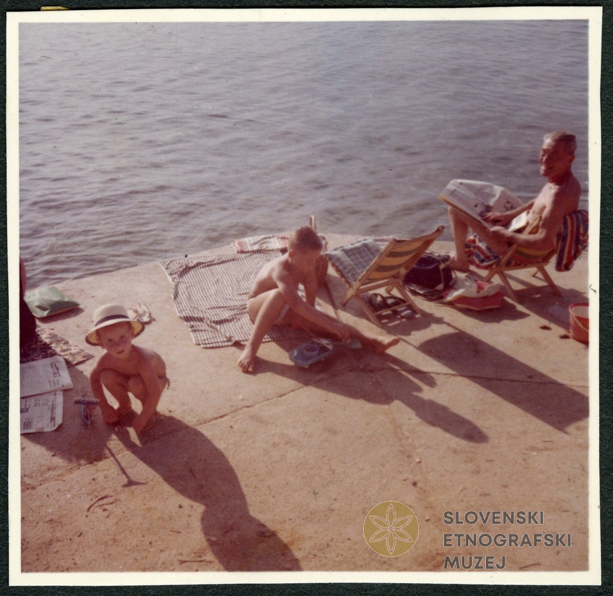 Joža Kozak z vnukoma na plaži. Šilo, otok Krk, 1966. V: album VI, Rogelj - Poirier.