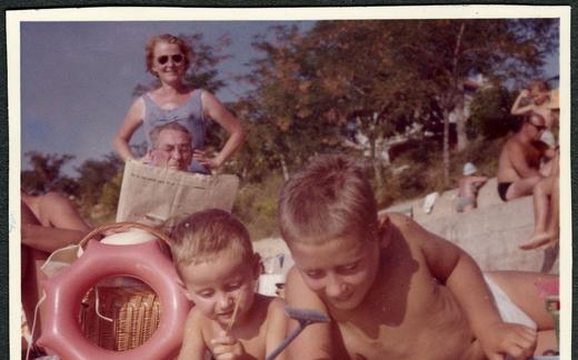Hilda in Joža Kozak z vnukoma na plaži. Šilo, otok Krk, 1966. V: album VI, Rogelj - Poirier.