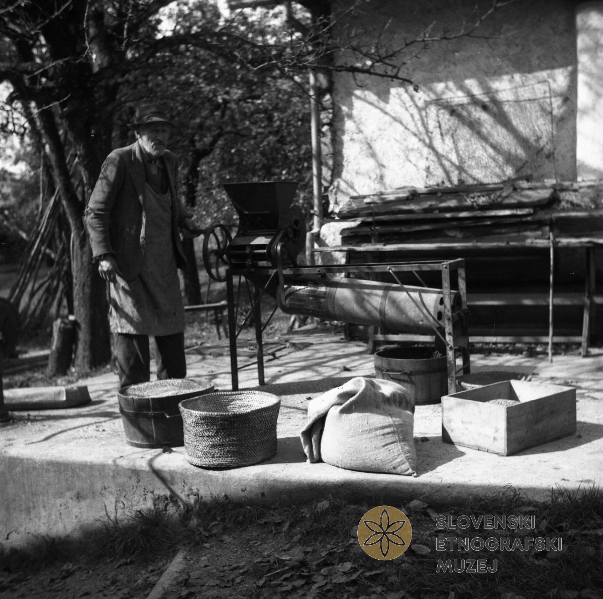 Čandrov oče Mikec Franc, Sv. Vrh 17, čisti žito s čistilnikom (lesen in pleten mernik). Teren 6-...