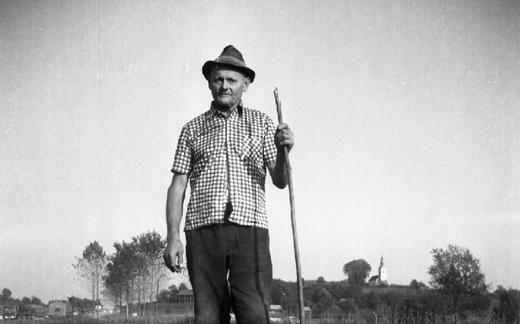 Anton Bevk, Dolenja Stara vas 44, pripovedovalec, na poti v hosto po preklje za slamnato streho...