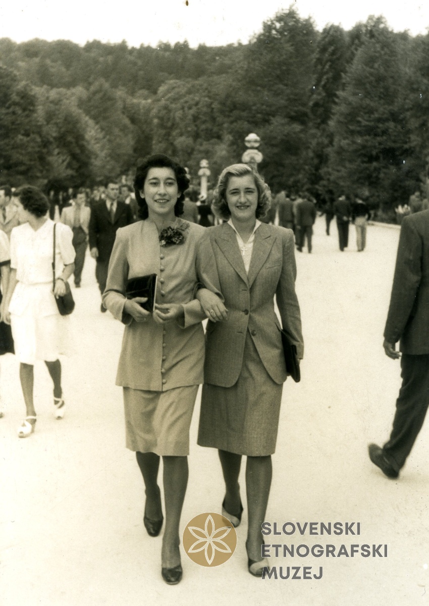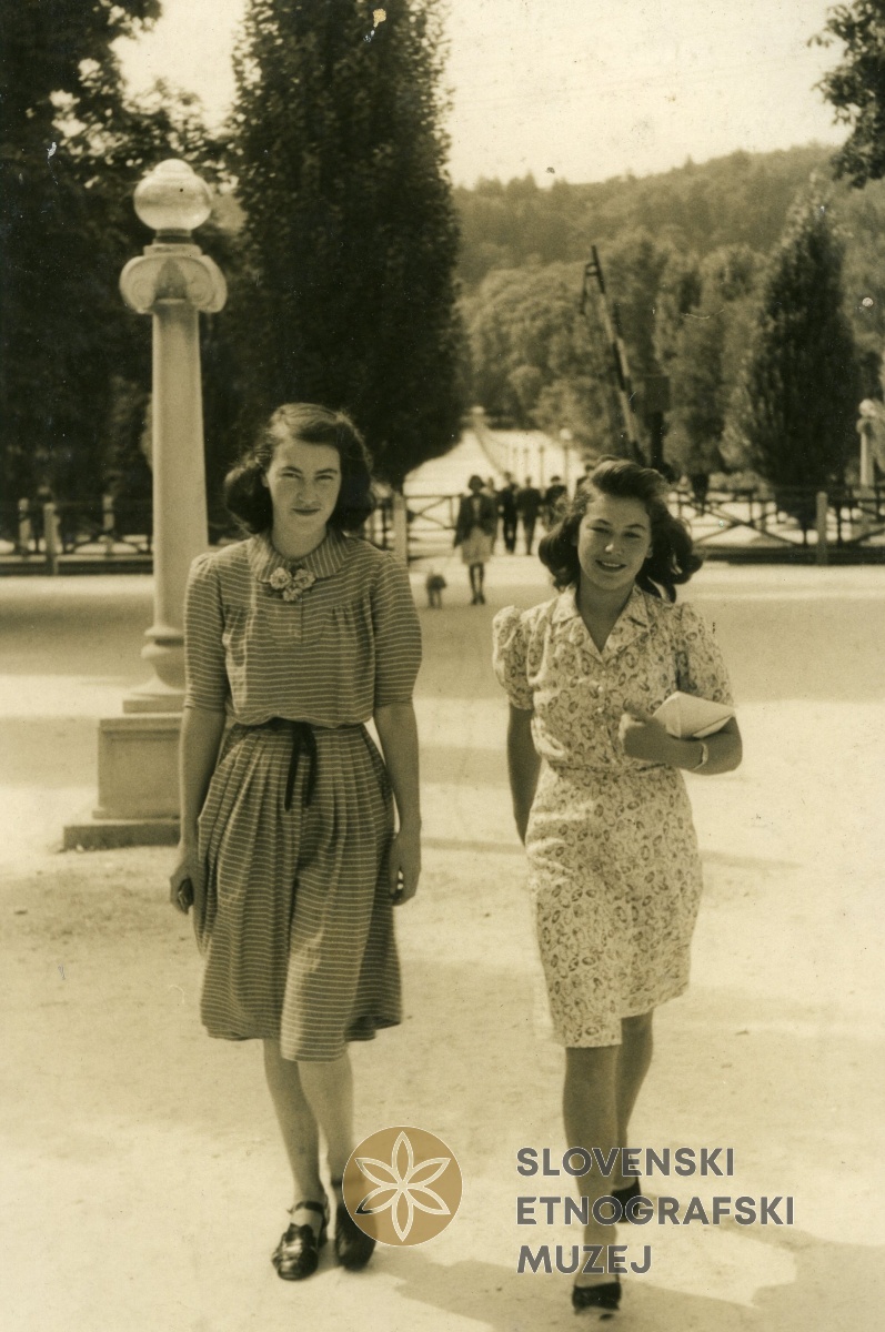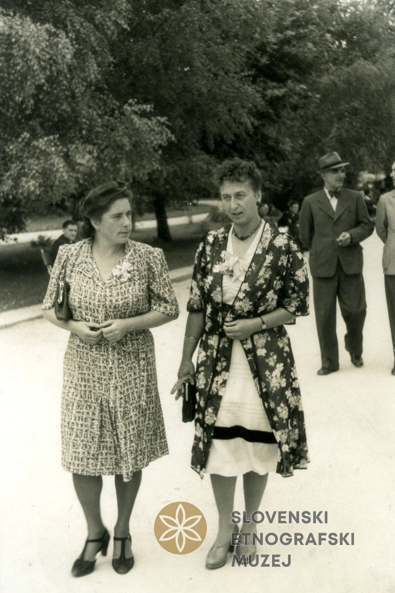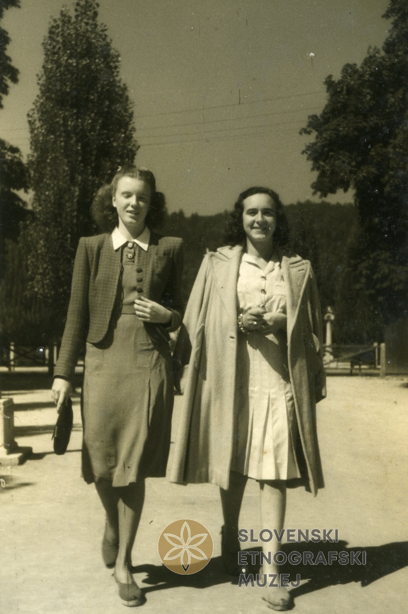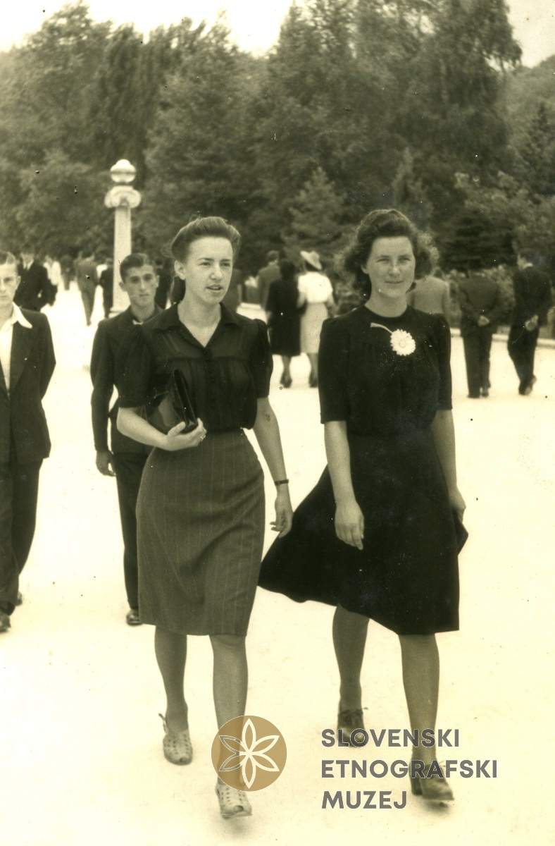 Dve dami z otroškim vozičkom na ljubljanski promenadi.