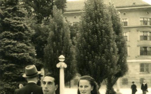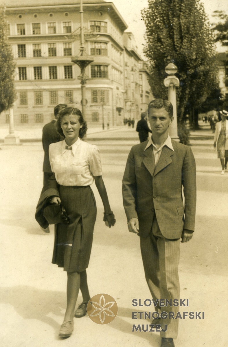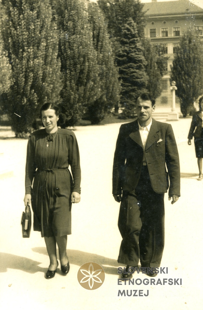 Gospod in gospa z dojenčkom v vozičku na ljubljanski promenadi.