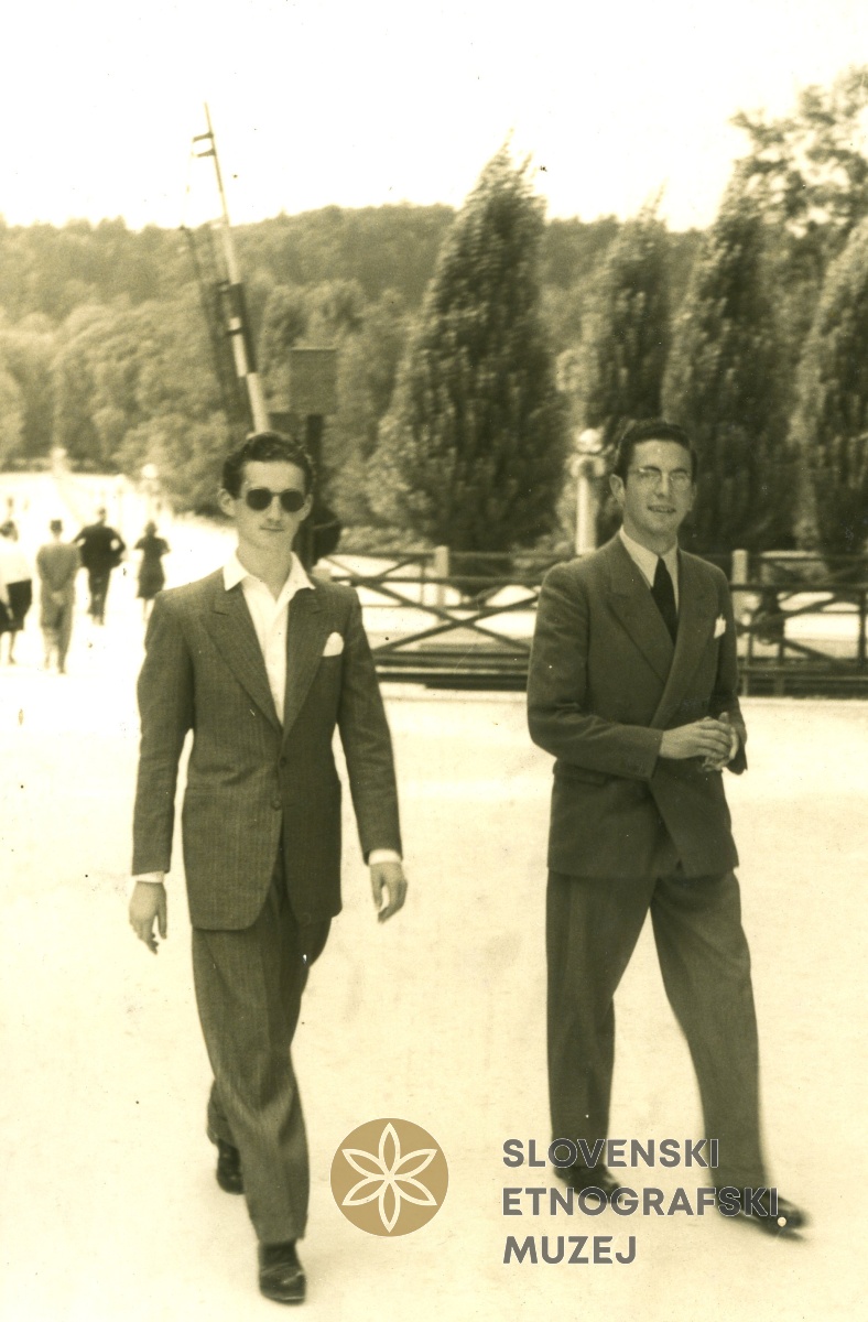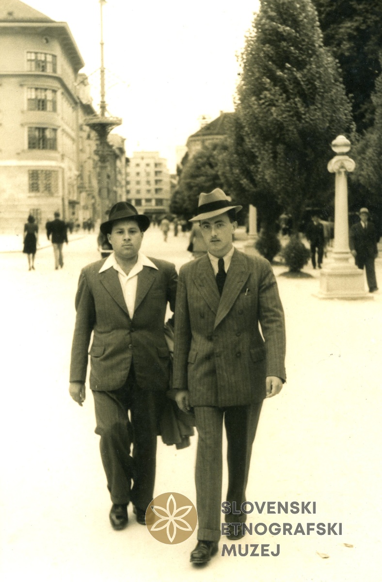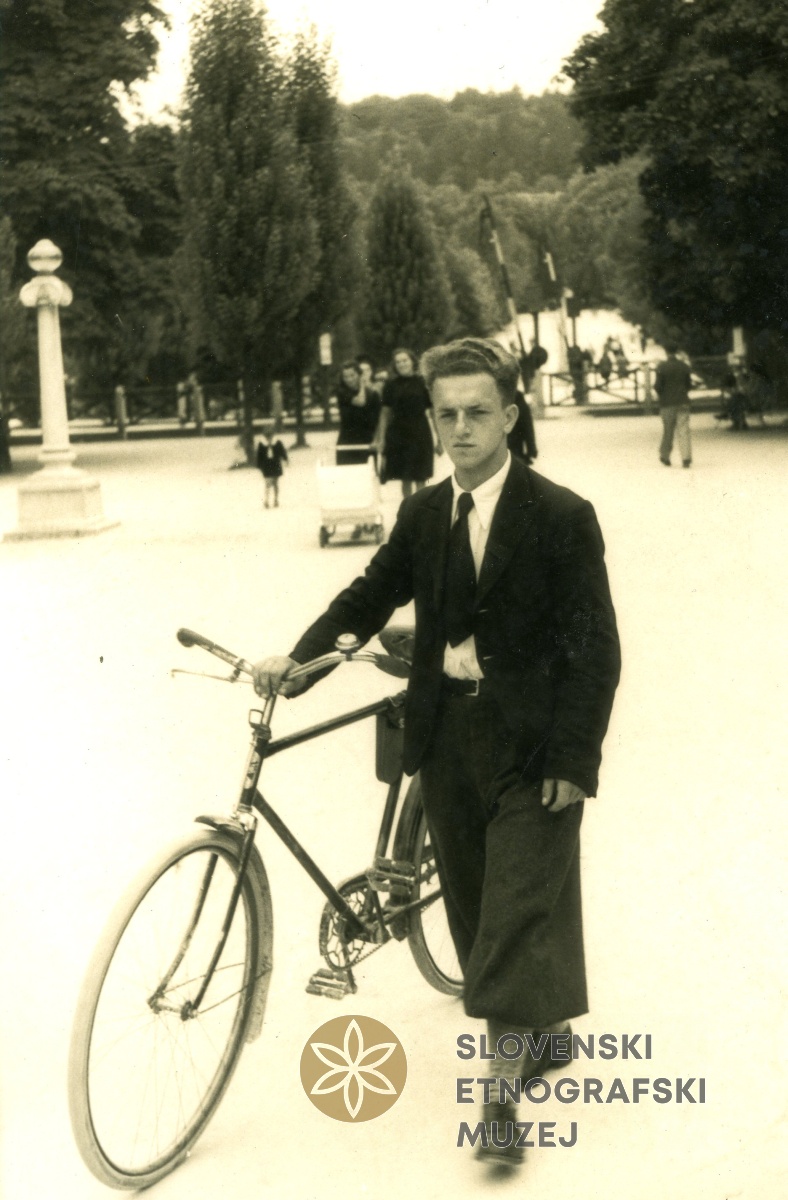 Dva mladeniča s kolesom na ljubljanski promenadi.