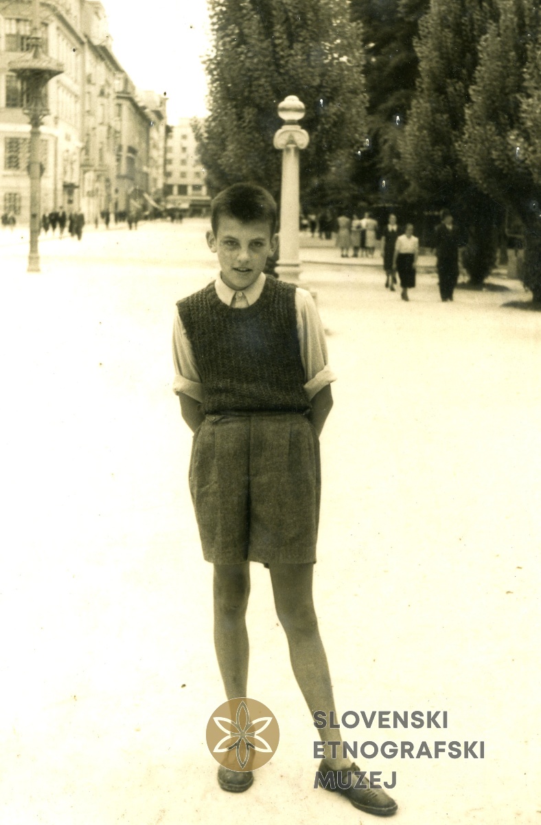 Fantek z dvema punčkama na ljubljanski promenadi.