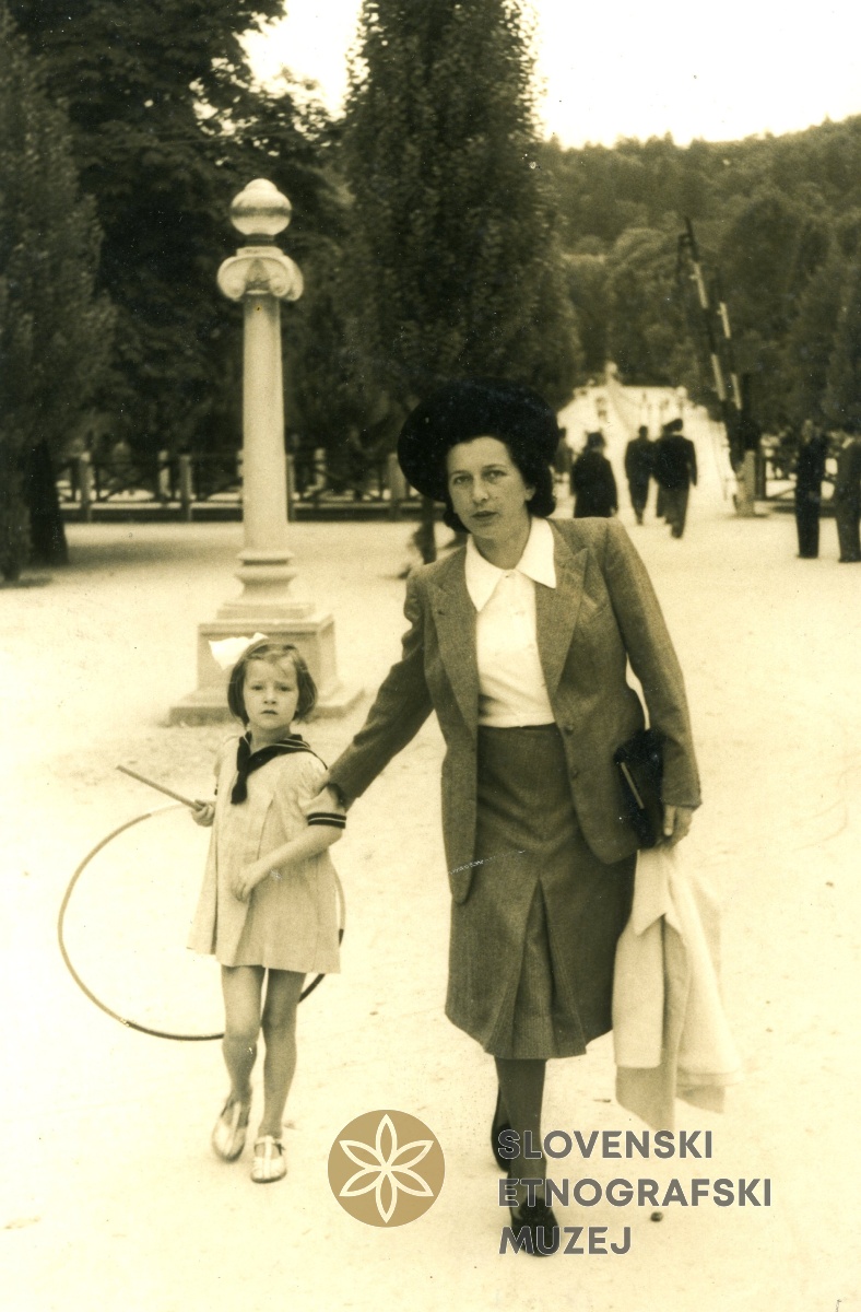 Gospa s fantkom na skiroju na ljubljanski promenadi.
