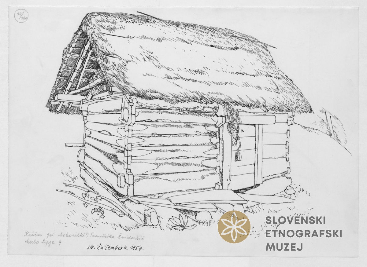 Lesena "kašča" s podzidano kletjo pri Pložejču. Iz fototeke študentskih ekip. Pridobljeno...