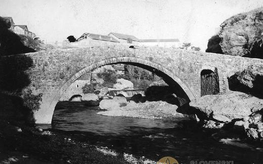 Pilonov komentar: Star most na Slap pri Vipavi (z vdelanim starim napisom). Star most čez potok...