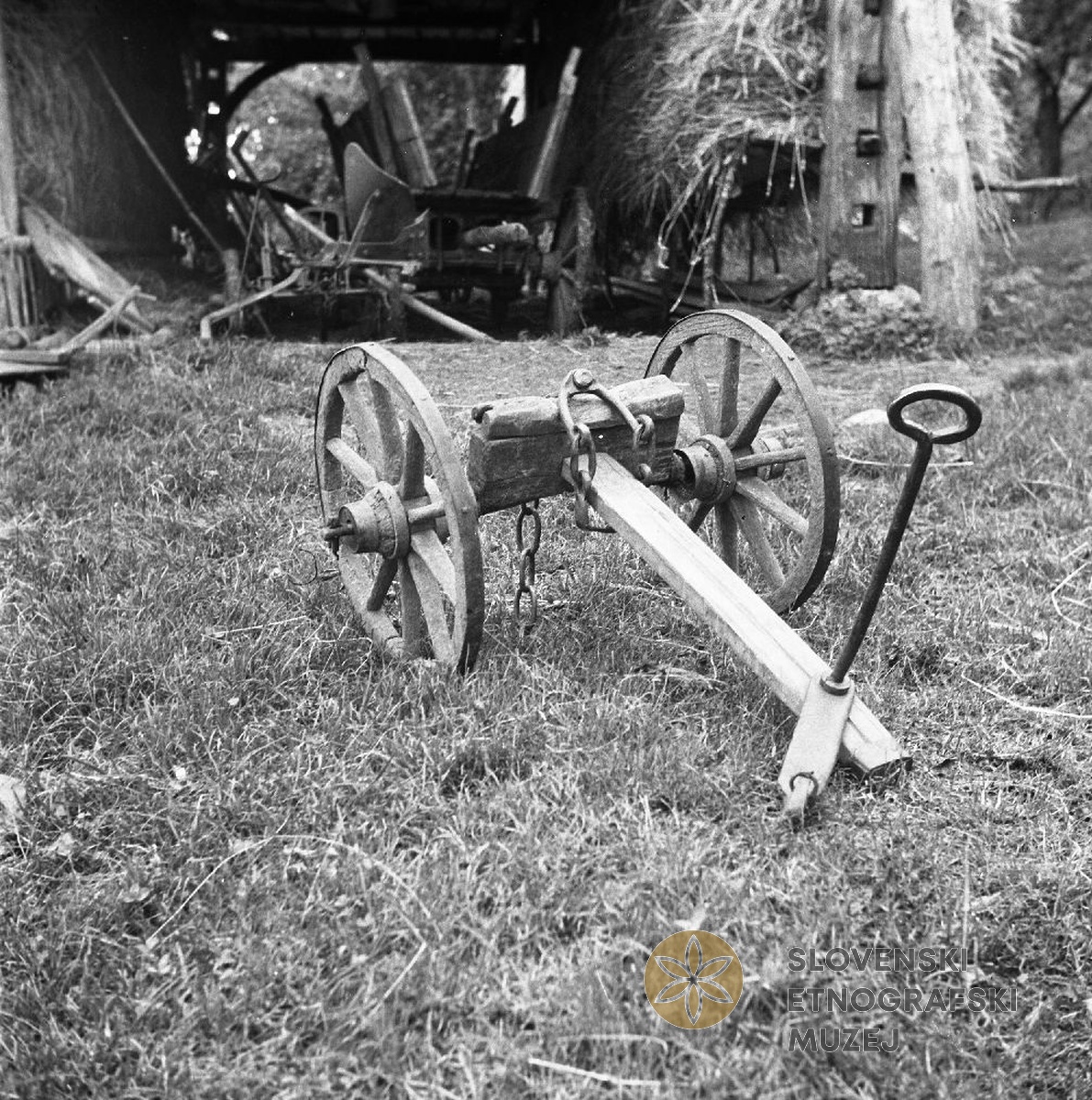 Stari "vavc" (valj) s smučkami, s katerimi peljejo na njivo, Sv. Vrh 5, pri Baletu. Teren...