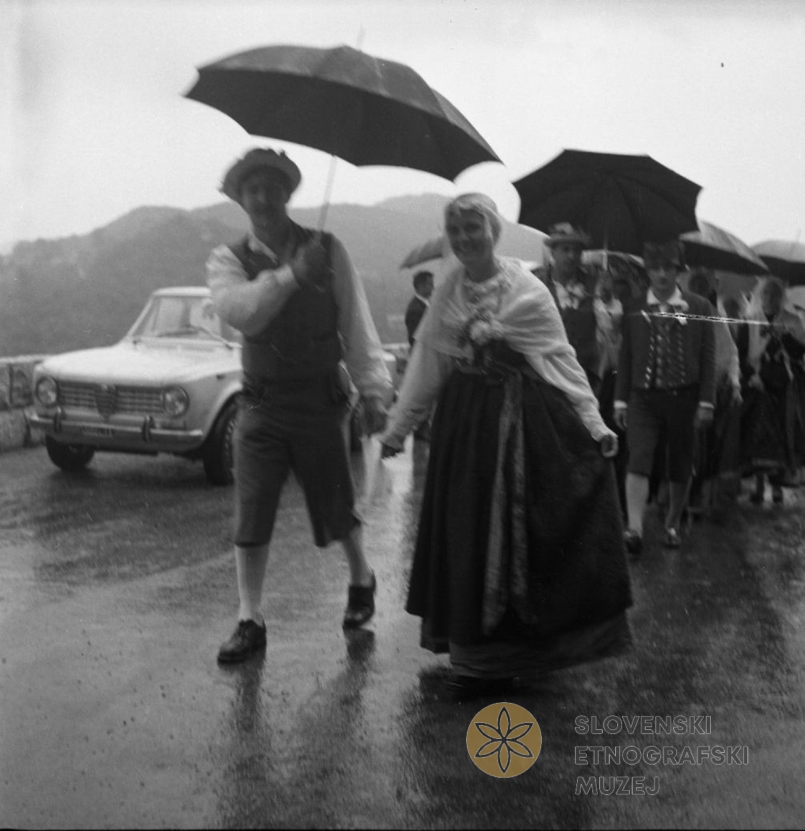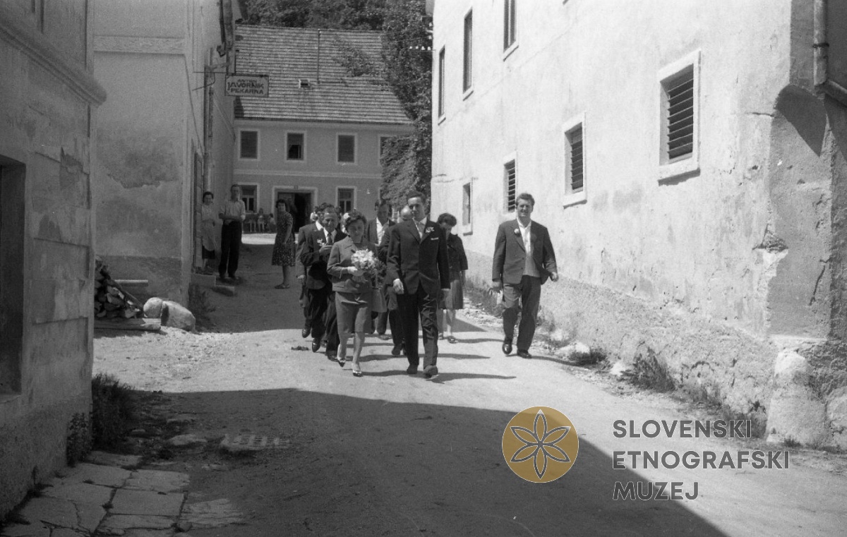 Vitanje, sprevod svatov gre skozi vas. Teren 20 - Južno Pohorje (1.-14.VII.1963).