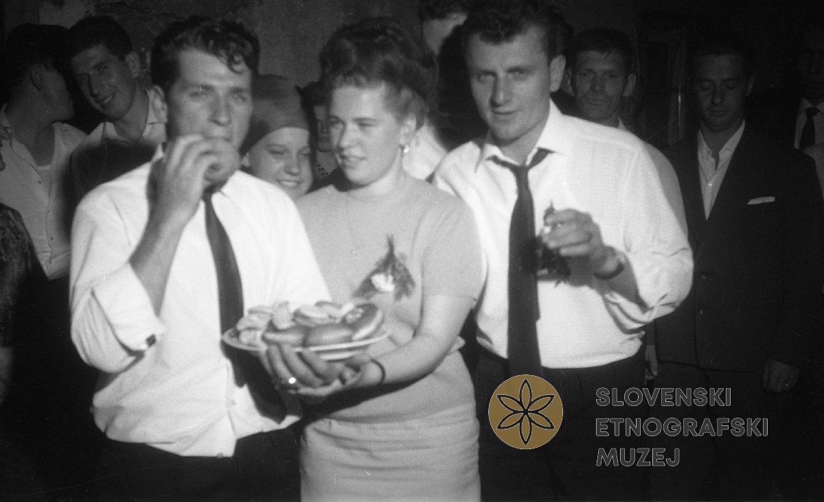 Nevesta deli krofe vouglarjem. Teren 21 - Škocjan na Dolenjskem, junij, julij in avgust 1964 ter...