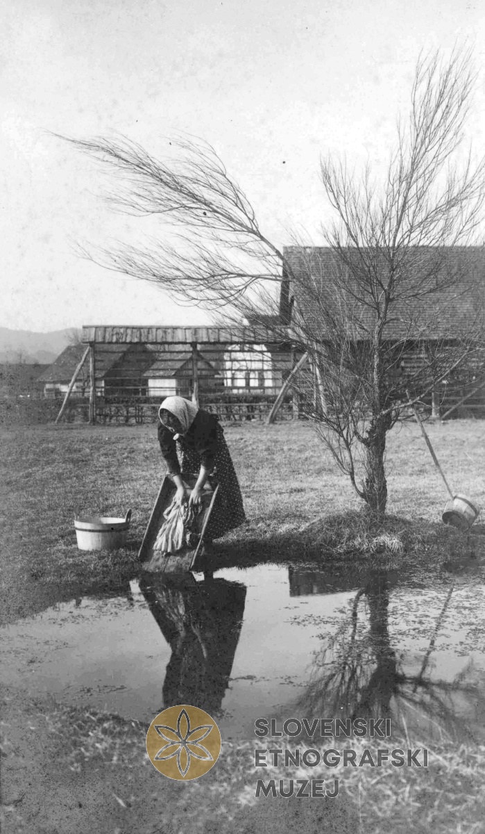 Perica z žehto na glavi, Vrhpolje, kjer hodijo prat v Belo. Teren 15 - Vipava, 1. - 28.8.1958.