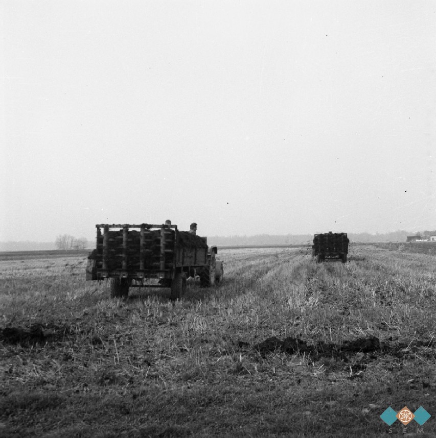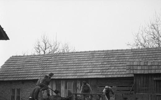 Medsebojna pomoč, vožnja gnoja s traktorjem, Banovci. Teren I - Koroška, Štajerska, Prekmurje.