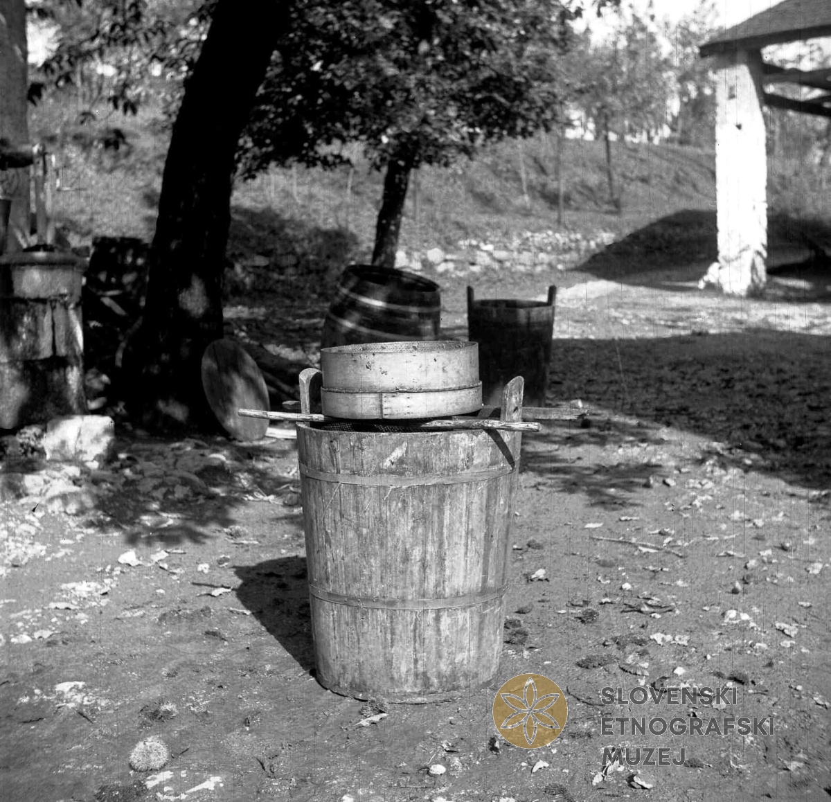 "Vrna" z vinskim rešetom, s katerim precejajo mošt. Posneto septembra 1958 v času trgatve...