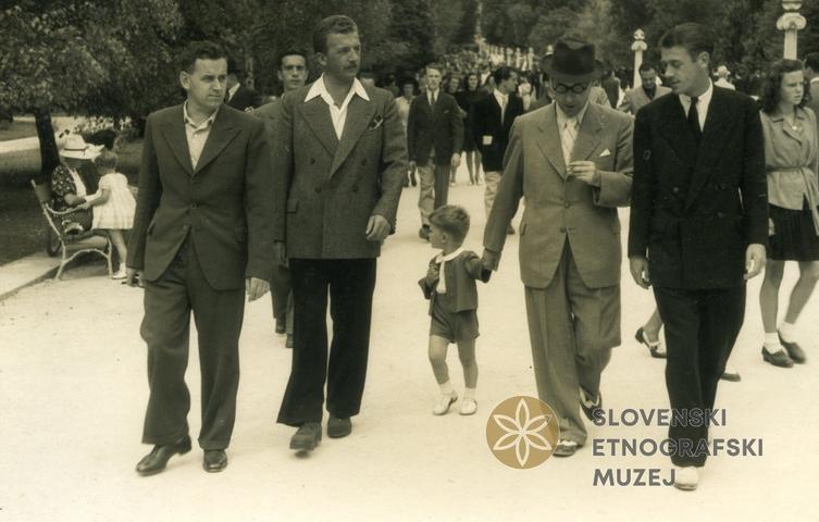 Moški z majhnim fantkom in troje moških na ljubljanski promenadi.