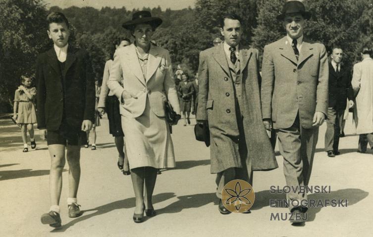Dva gospoda, dama in fant na ljubljanski promenadi.