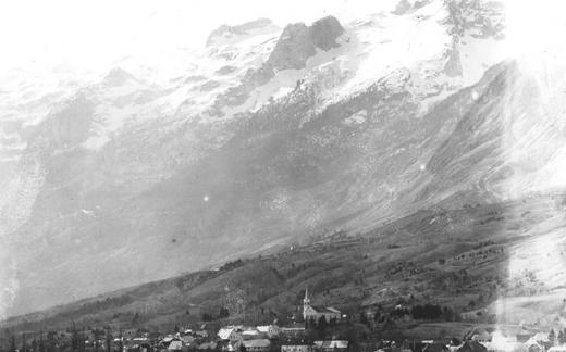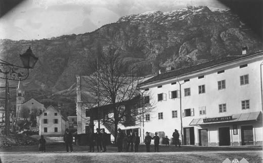 Hiše v središču Bovca. Na desni strani Trgovina mešanega blaga in deželnih pridelkov Leopolda Jonka.