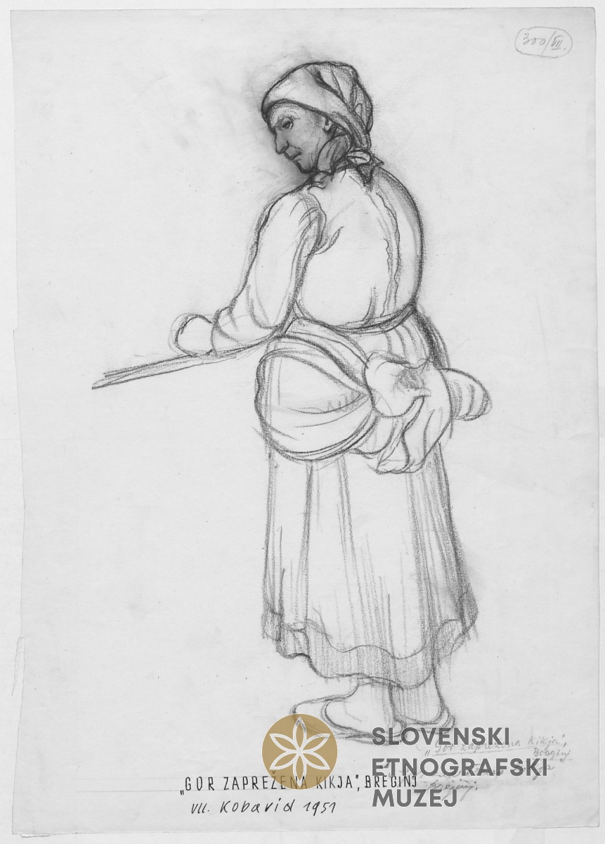 Ženska s košo in motikco, Breginj. Teren 7 - Kobarid, 3.7. - 3.8.1951.