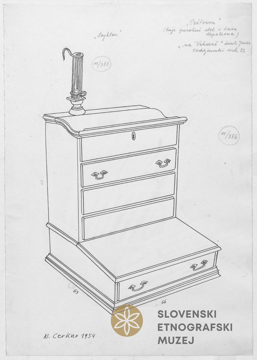 Peštorən (predalnik, baje poročni stol v času Napoleona). Cerkljanski Vrh 22, na Veharš, Marik...