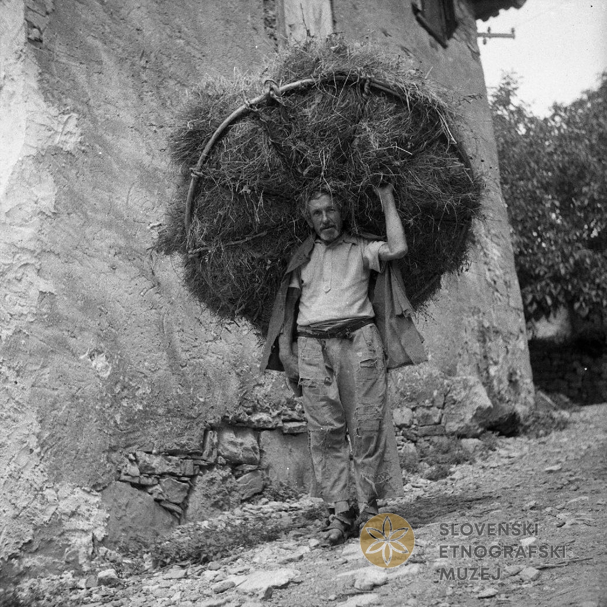 V "čajbi" (žbrenčja, brencina drugod v Brdih) nese seno, Dolenji Brezovk. Teren 10-...