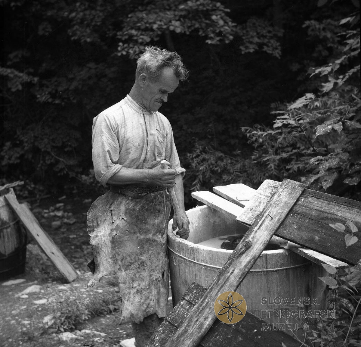 Strojar Hadalin Jože meša kože v apnu. Dolenji Novaki 20. Teren 11- Cerkljansko (30.7.-1.9.1954).