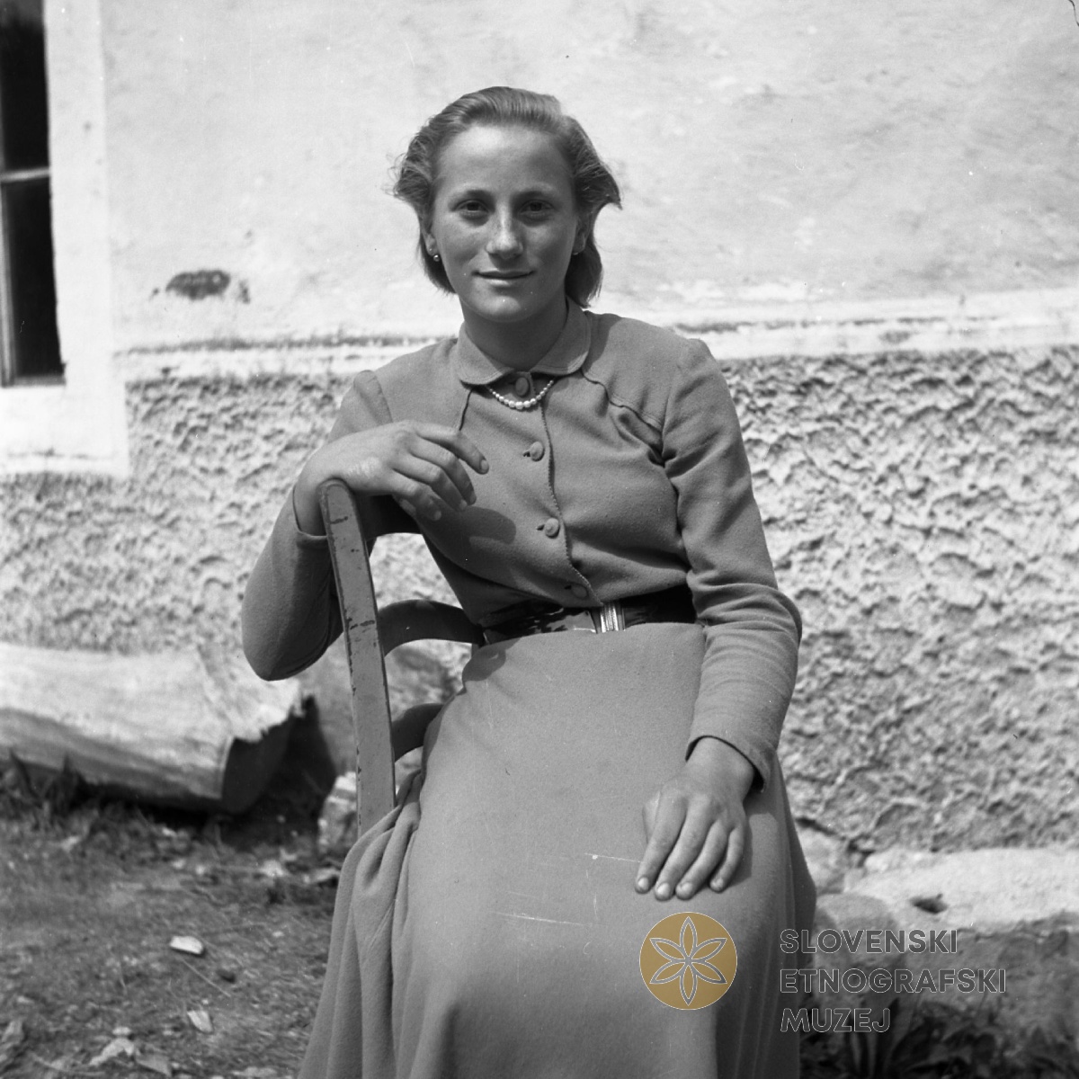 Milka Ivančič iz Golca, v današnji nedeljski noši. Teren 12- Brkini (1.-31.8.1955).