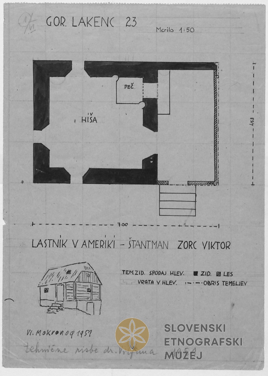 Hiša: 1 fasada, 1 skica objekta, Gorenje Laknice 23. Lastnik v Ameriki - Štantman Zorc Viktor.