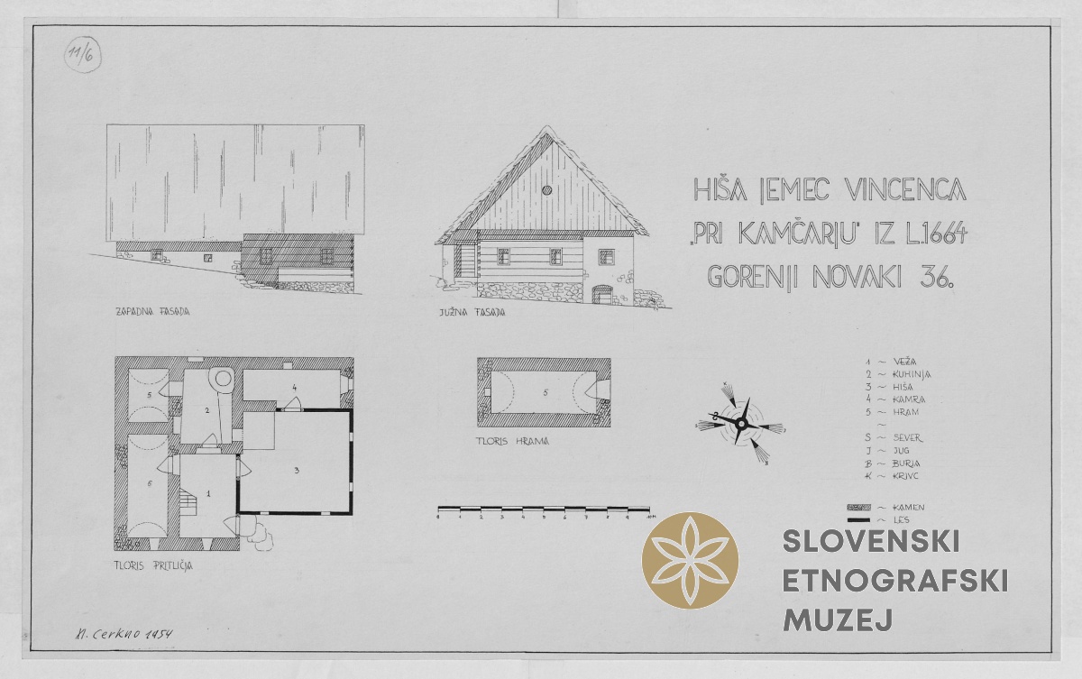 Lesena kmetska hiša z leta 1664, u Kamnah, Gorenji Novaki. Teren 11- Cerkljansko (30.7.-1.9.1954).