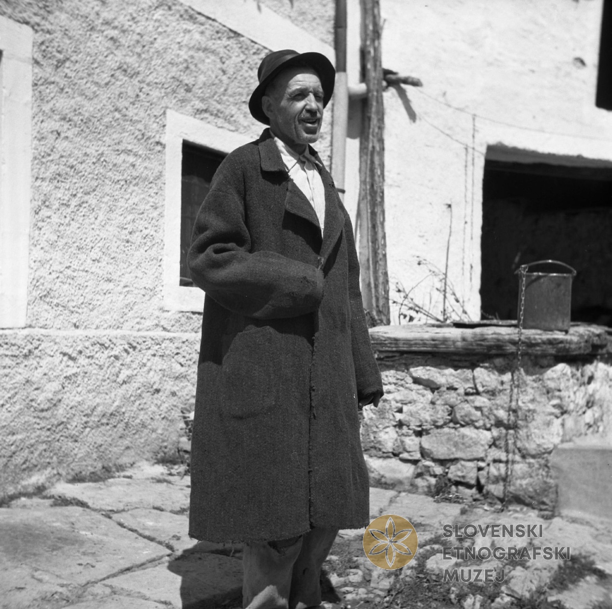 Anton Fatur, 62 let, ovčar in kmet v stari zimski suknji (plavo obrobljeni), sedaj uporabljajo za...