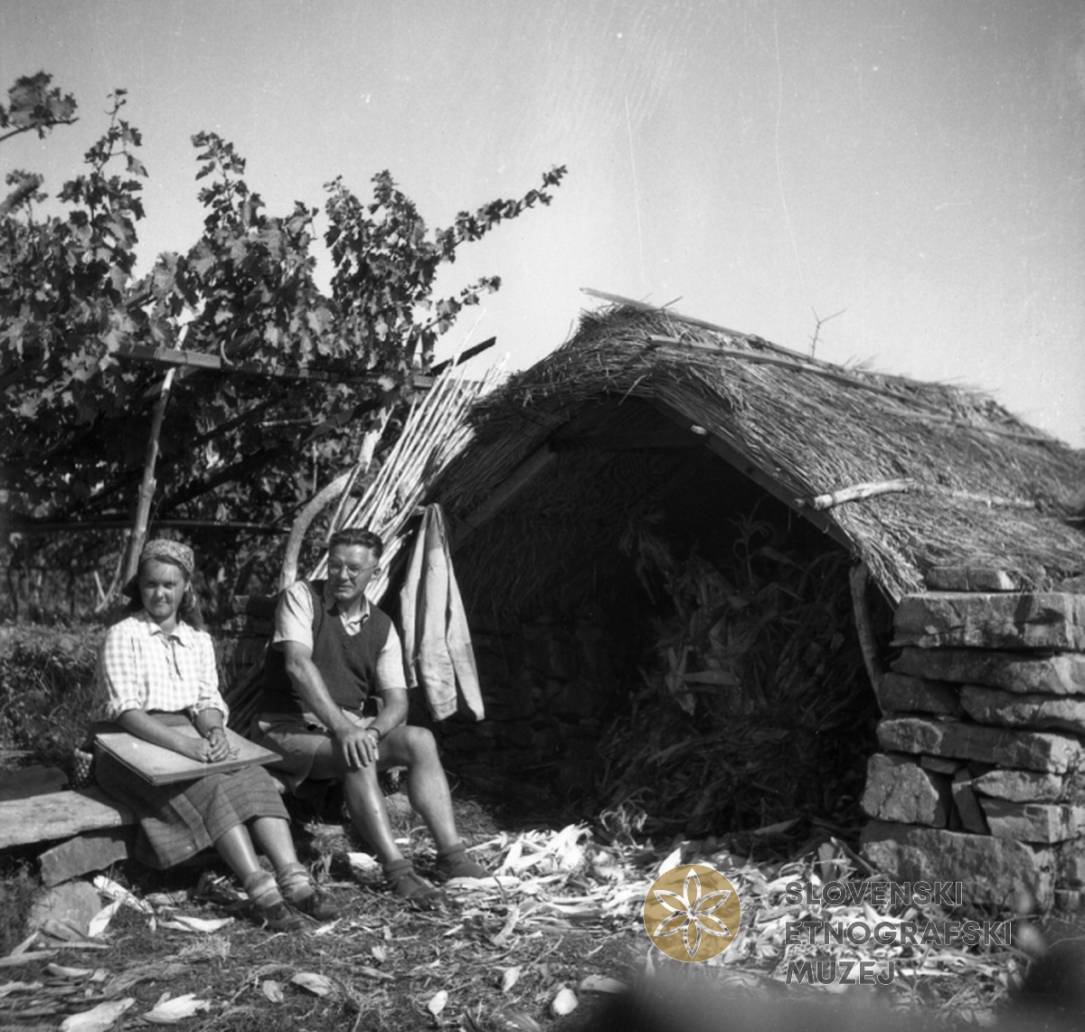 "Galuza" (koča) pri Kolombinih med vinogradi. Spredaj sedita dr. Juvančič in Slak...