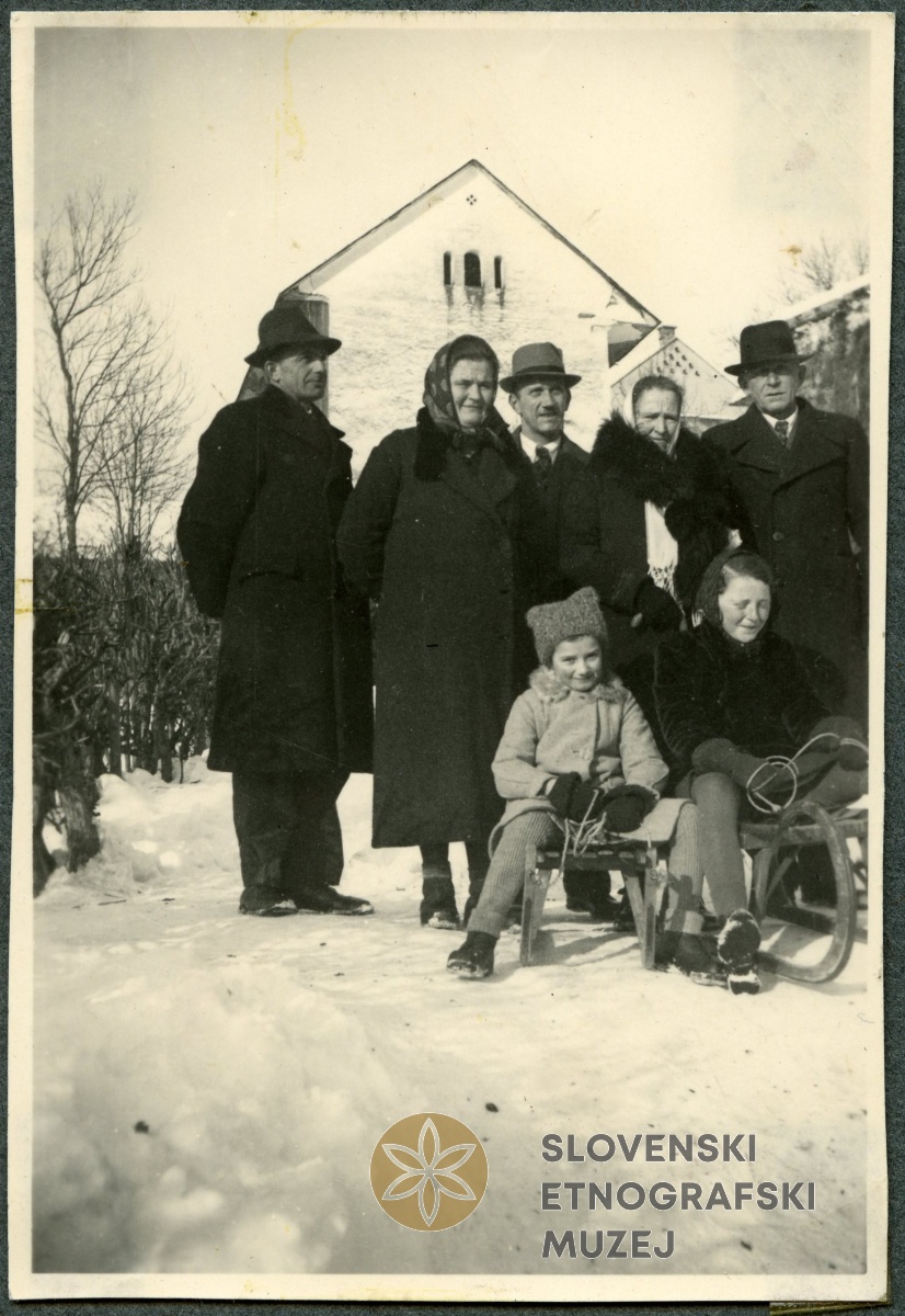 Družinski portret pred hišo, otroka sedita na sankah. V: album VIII.