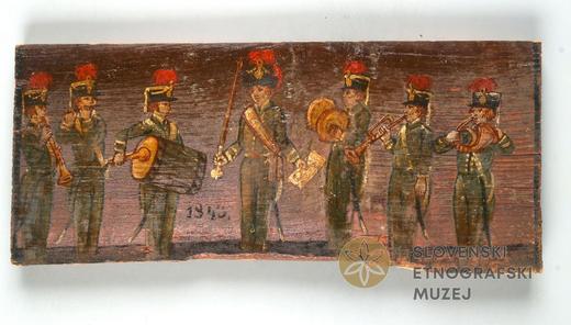 Spodaj med kapelnikom in bobnarjem je letnica 1843. Delo slikarske obrtniške tradicije delavnice...