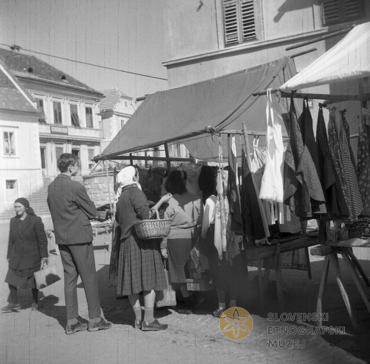 Štant (stojnica) z žensko konfekcijo na sejmu v Metliki. Teren 22 - Drašiči, Bela Krajina. Posneto...