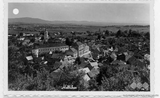Skupina hiš, Metlika. V ospredju hiša s slamnato streho.