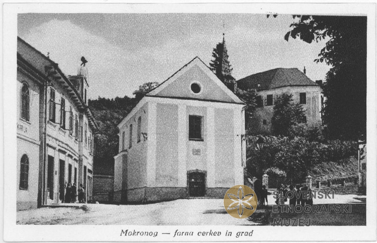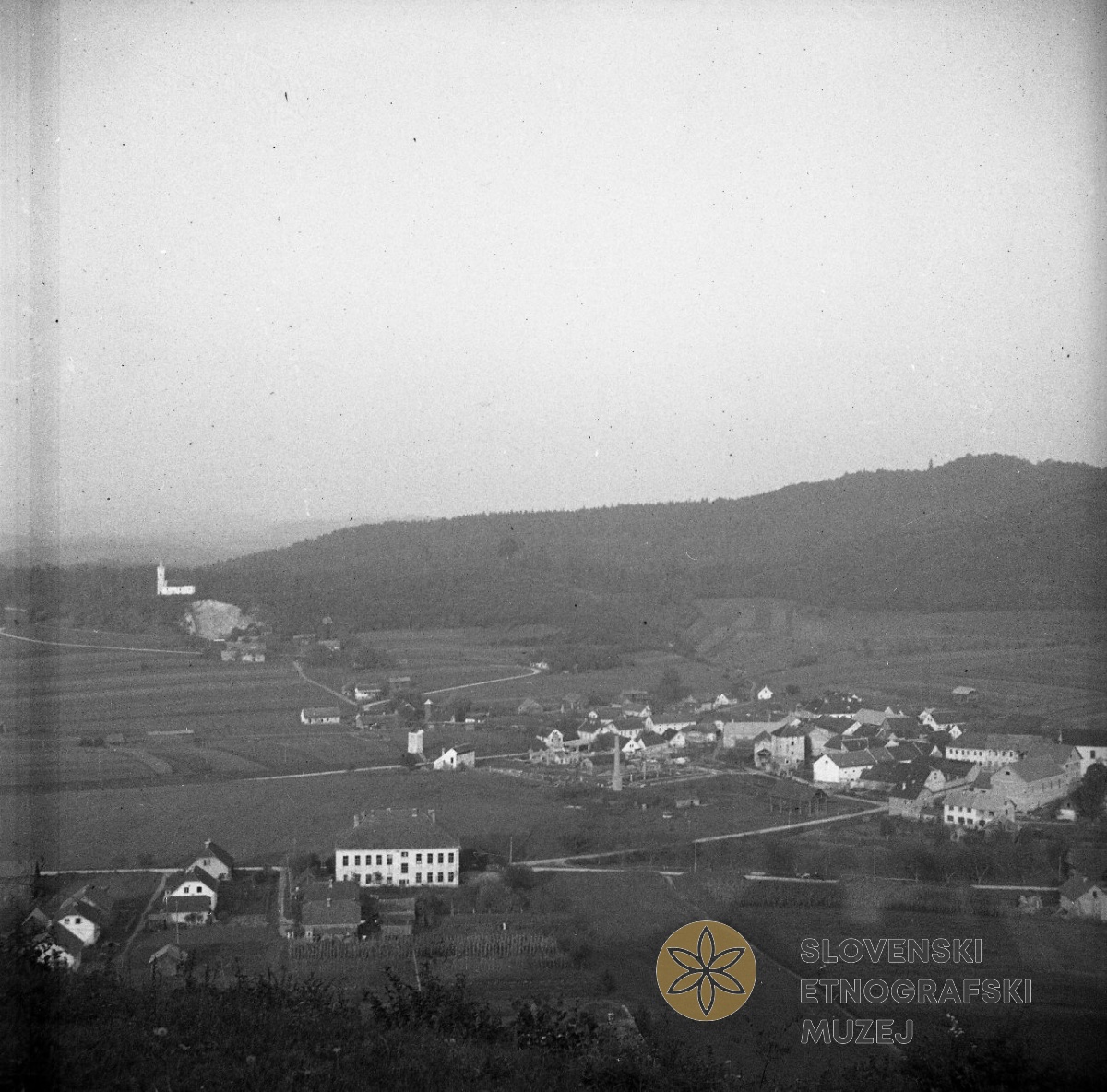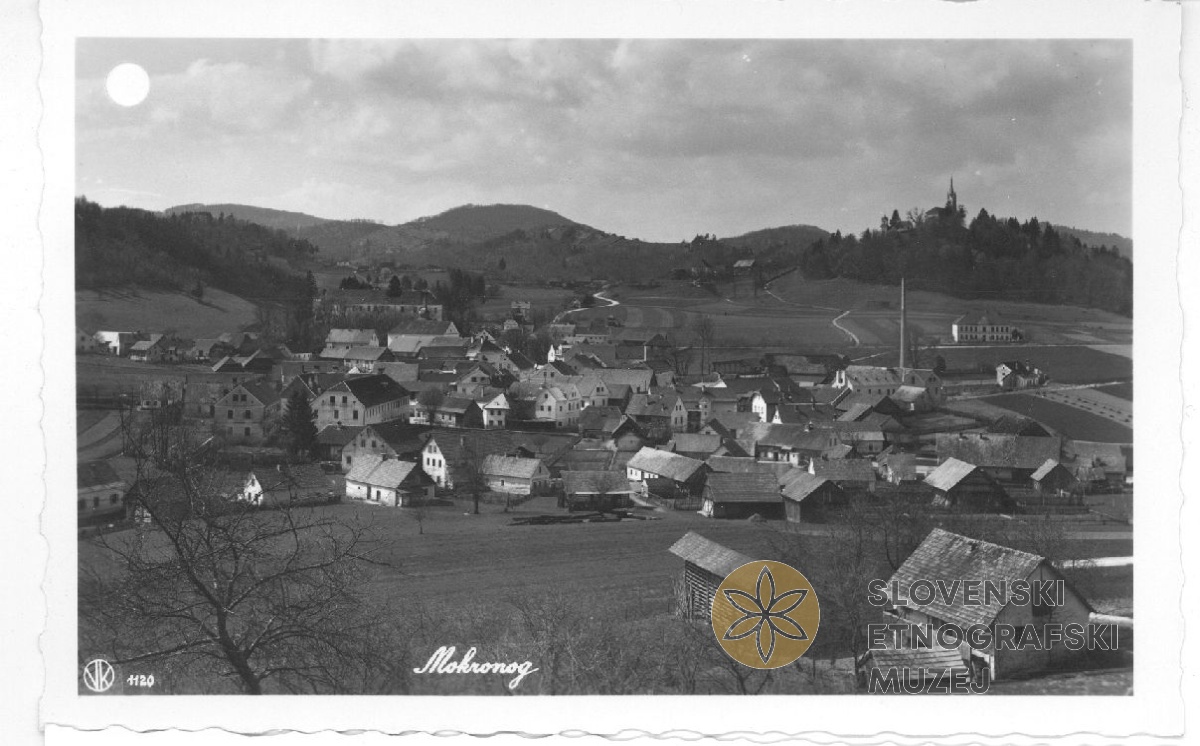 Pogled na Mokronog. Na fotografiji označena šola v Mokronogu in cerkev na Žalostni gori...