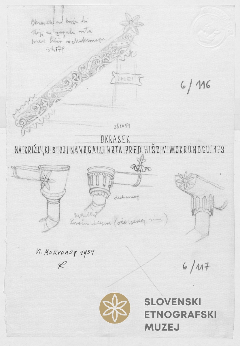 Okrasek na križu, ki stoji na vogalu vrta pred hišo, Mokronog 179.