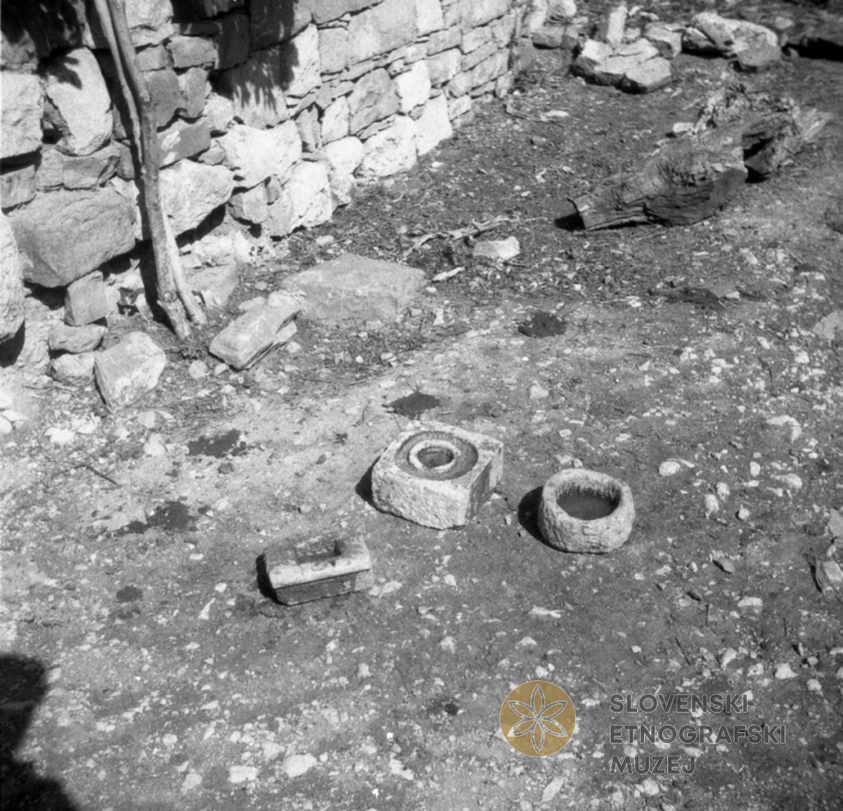 Kamen za olje, koritce za kokoši, drvo za mestit krompir in lopata za kruh pri Starca v Ospu. Teren...