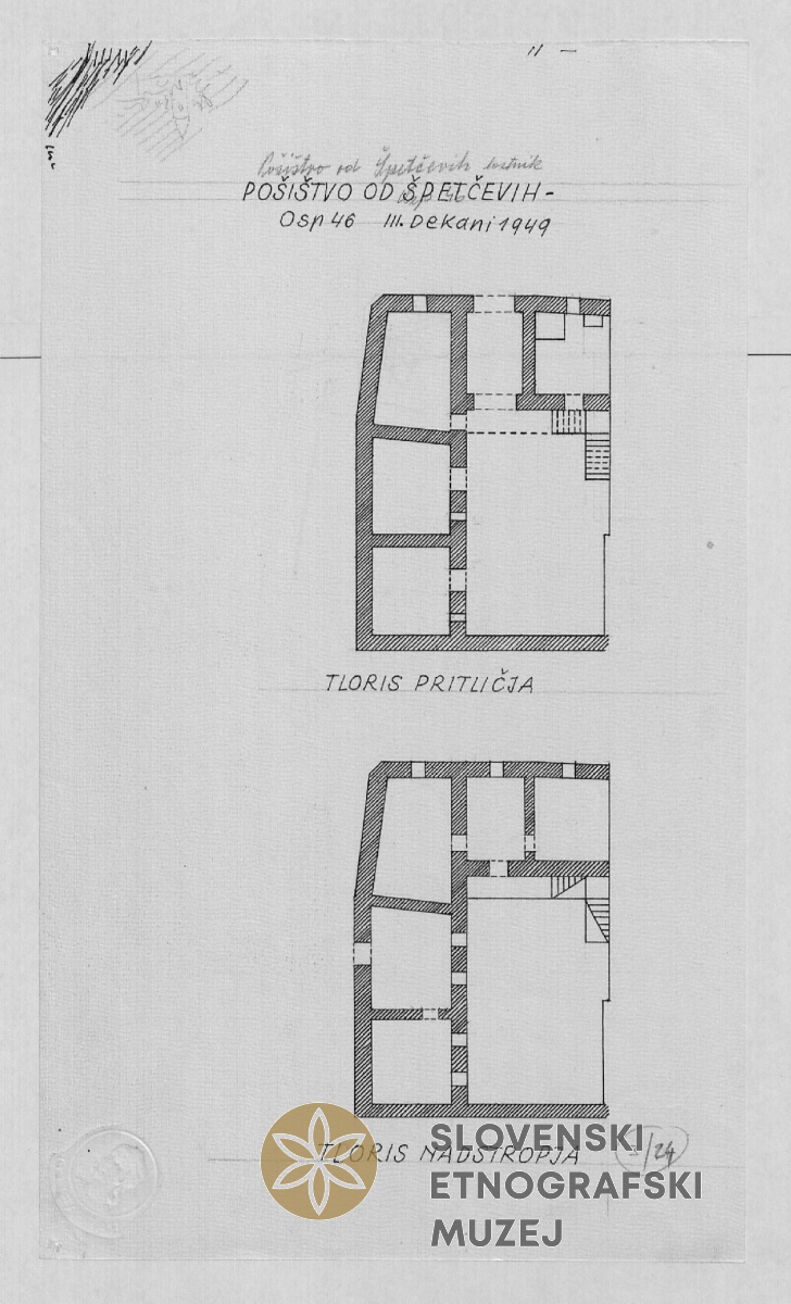Pošištvo od Špetčevih - tlorisa pritličja in nadstropja. Lastnik Špetčevi, Osp 46.