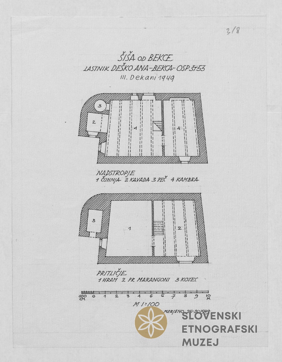 Šiša (hiša) od Bekce - tlorisa nadstropja in pritličja, merjeno 25.9.1949. Lastnica Ana Deško -...