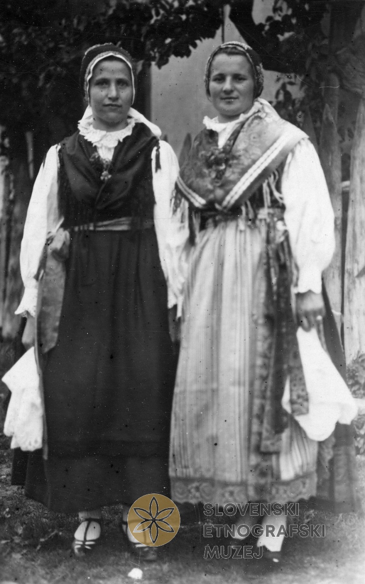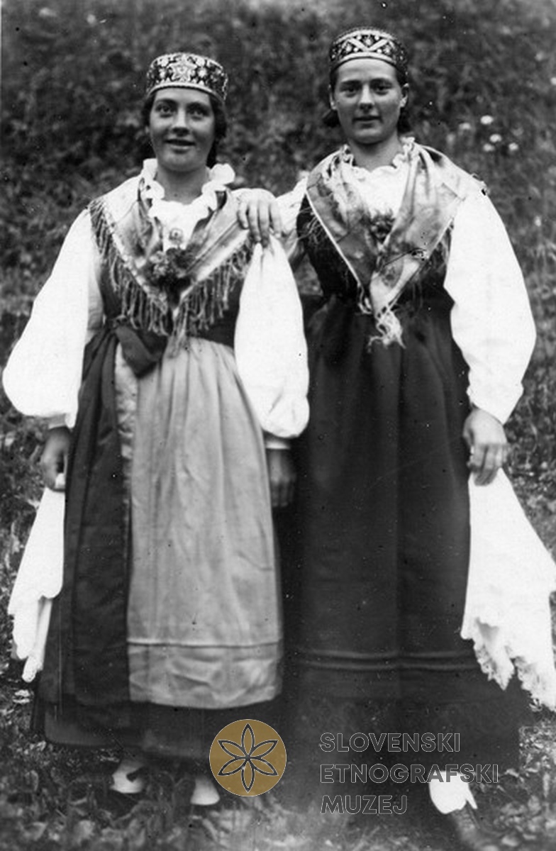Dekleti sta oblečeni v nošo, kakršna je bila v navadi za posebne priložnosti (procesija, večji...