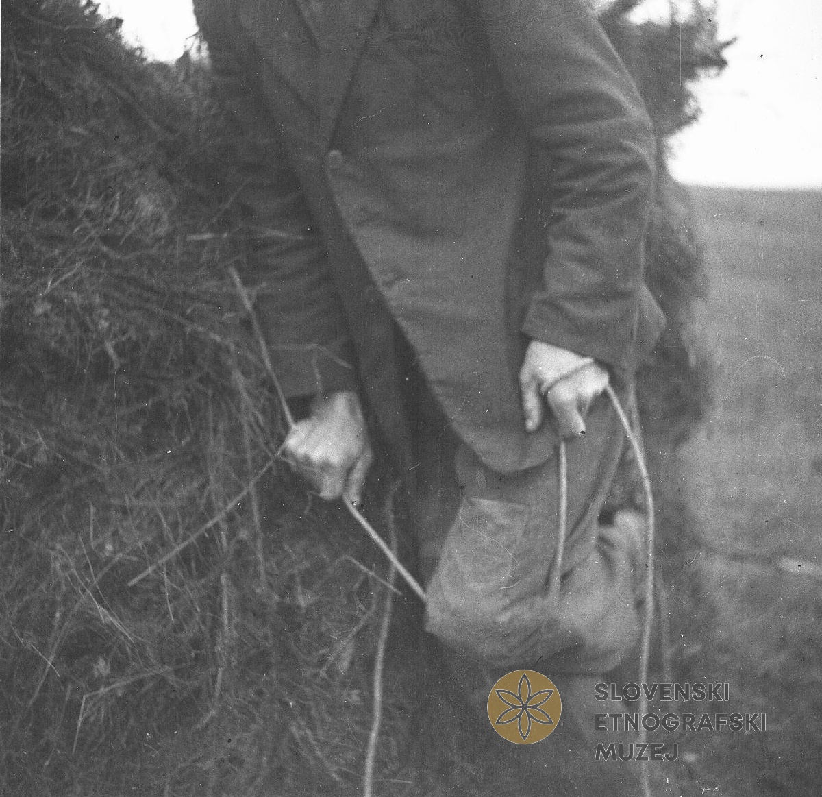 Tako zadržuje breme, če je prevelika strmina. Čez ramo ima "vlak" (trto), Potoki. Teren 7...