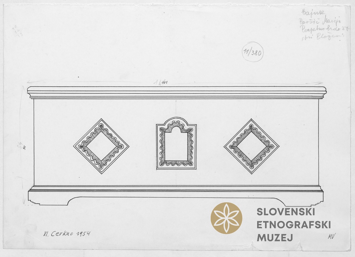 Bajnk (skrinja). Prapetno Brdo 27, Pavšič Marija, pri Blažcu.