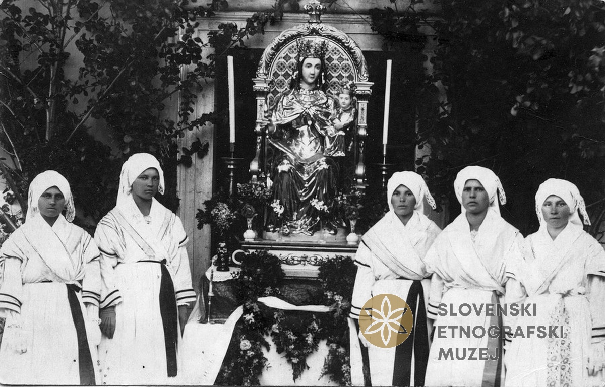 Predloka F0000882 F0000882 Dekleta iz fare Predloka pred kipom matere božje. Oblečene so v praznično nošo, kakršna je bila... Kostumiranje in uniformiranje: narodna noša, uniforme
