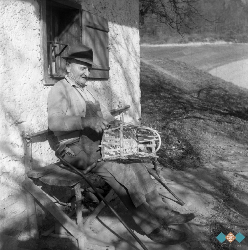 Guček Janez, Prešna Loka 26 pri Sevnici, še plete koše, cajne ipd. Plete "cajo za krompir...