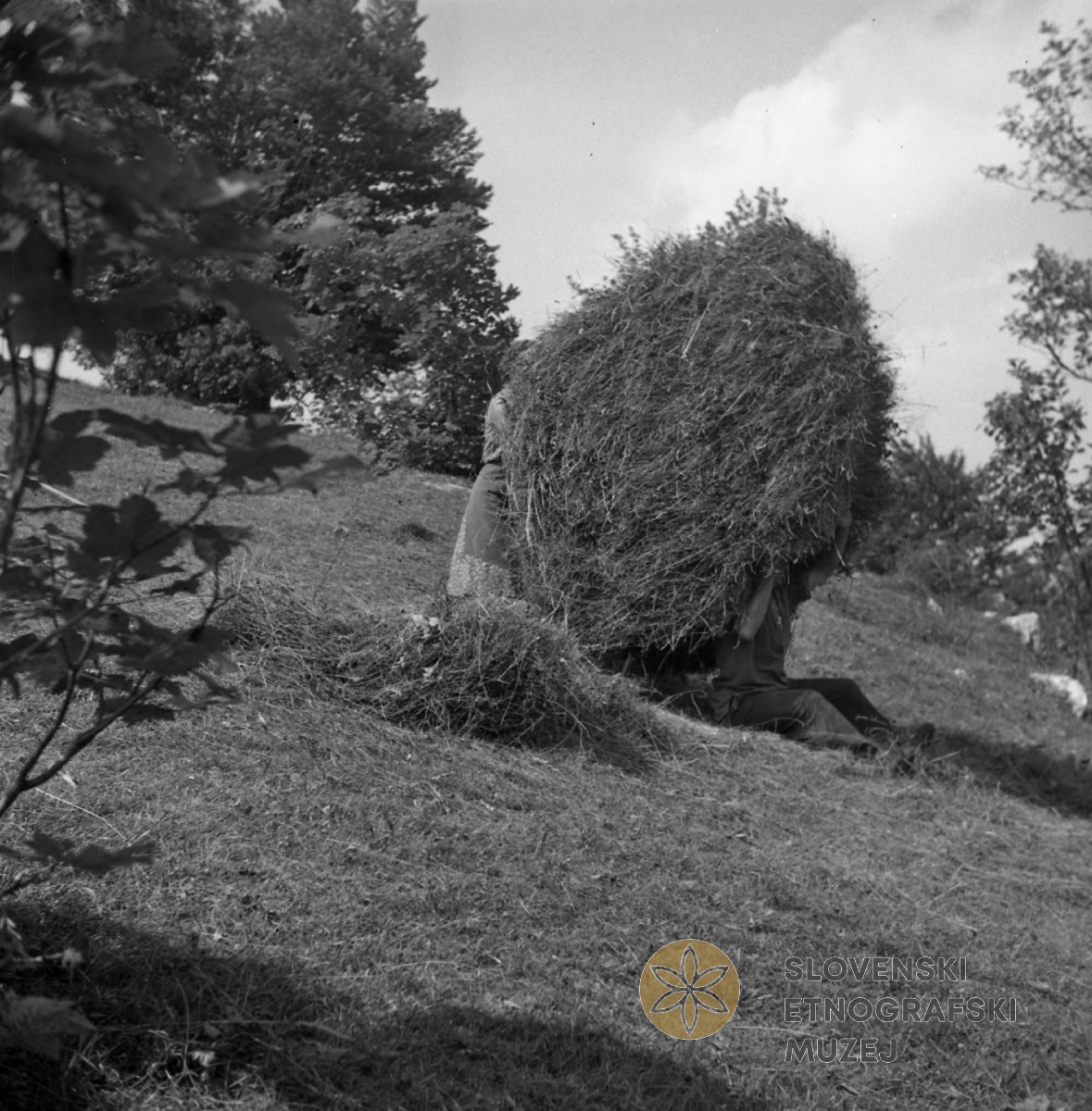 Seneno breme je zloženo (narejeno) in pripravljeno za zvezat. Teren 16- Črni Vrh- Vojsko pri Idriji...