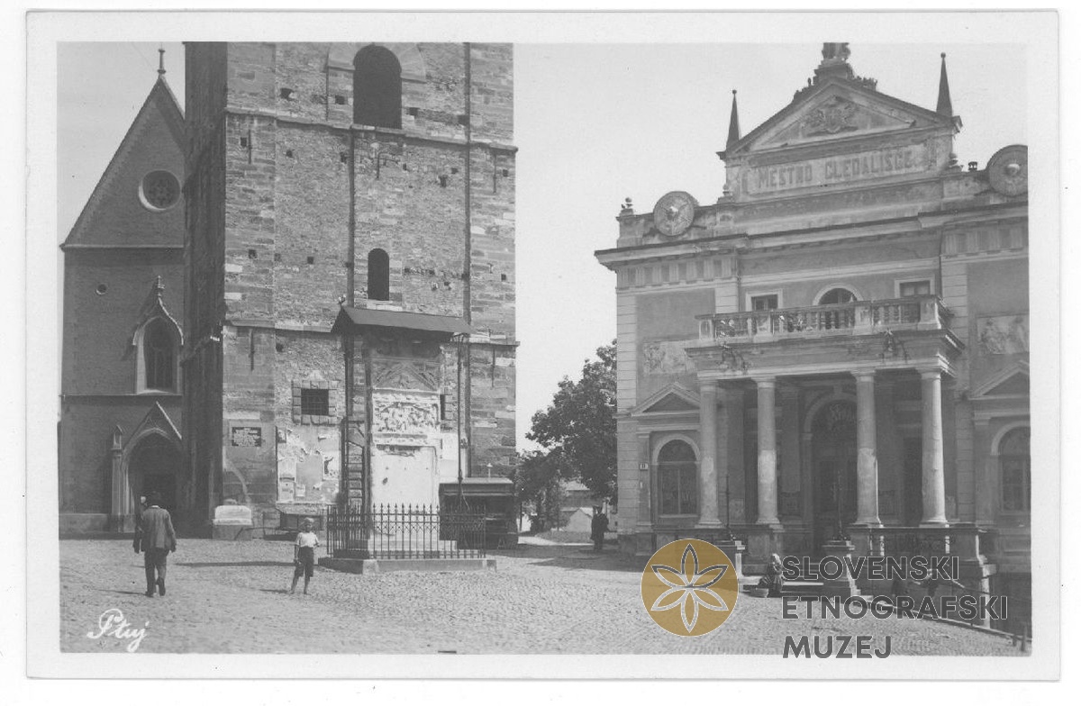 Mestno gledališče in Orfejev spomenik pred mestnim stolpom na Slovenskem trgu.