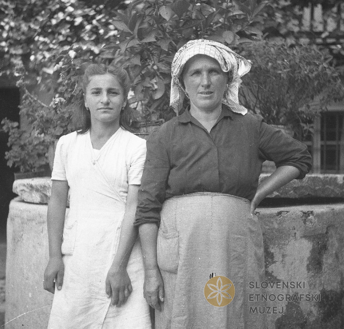Toncova hiša; spredaj Lojza Tonova in Pavla Tonikova, Robidišče. Teren 7 - Kobarid, 3.7. - 3.8.1951.