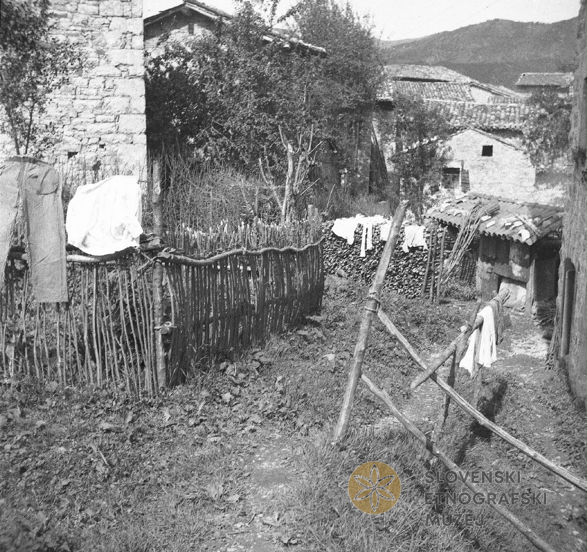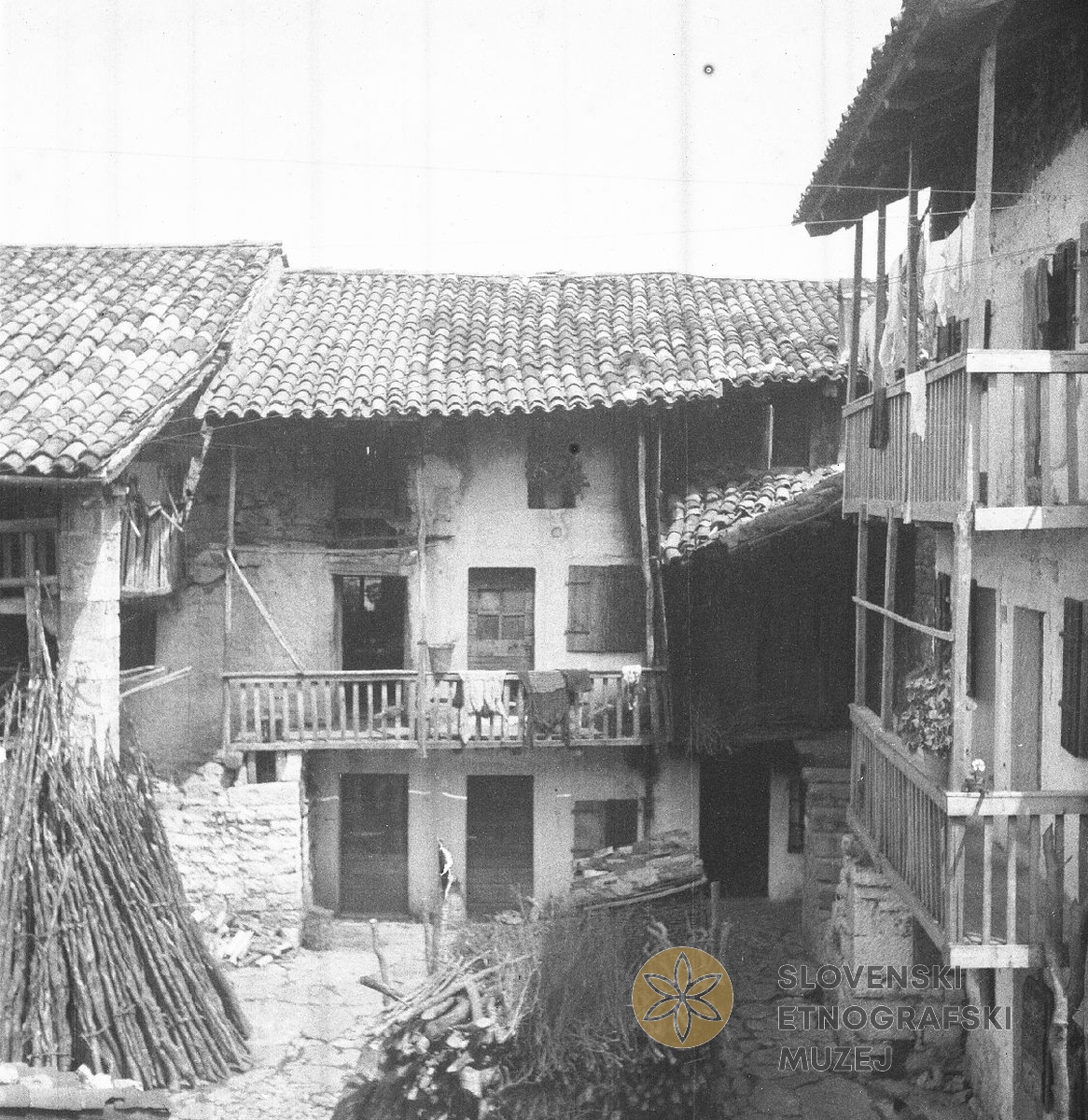 Robidišče 23 pri Toncovih; spredaj kulet za prase (svinjak), drva za staže (vmes ulica). Teren 7 -...