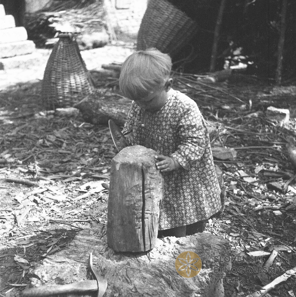 Otrok s "kanjcem" in kokoš pod košem, Robidišče. Teren 7 - Kobarid, 3.7. - 3.8.1951...